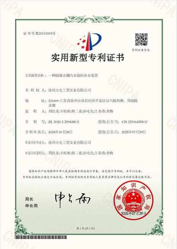 近日,實業(yè)公司“一種隔爆水棚內水袋的補水裝置”獲得國家實用新型專利授權。該裝置既能滿足隔爆水棚補水的及時性又無需工人爬上爬下加水,安全性高,同時安裝和維護簡單方便。