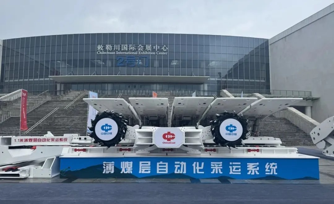 室外展區展示的薄煤層自動化采運系統設備,可實現采高1.1m及以上薄煤層工作面全自動化開采